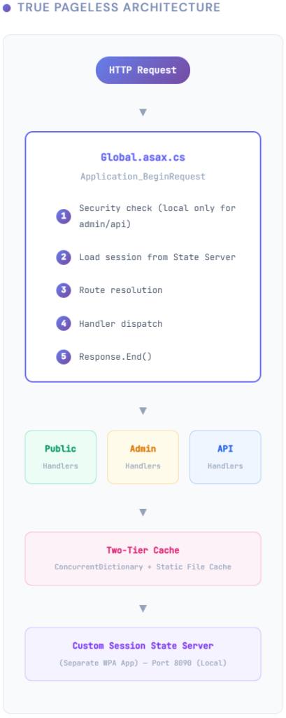 By intercepting requests at Application_BeginRequest and integrating a custom Session State Server built with the same principles, we create a fully consistent, high-performance architecture with zero ASPX files.