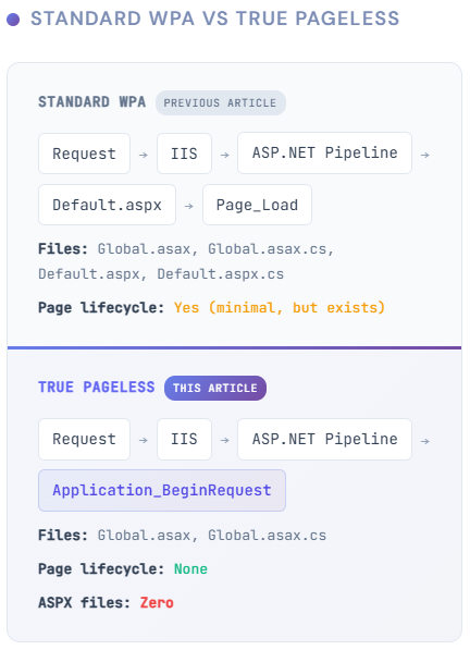 The answer is no. By intercepting requests at Application_BeginRequest in Global.asax.cs, we can build a truly pageless architecture—zero ASPX files, zero page lifecycle, pure HTTP request handling.
