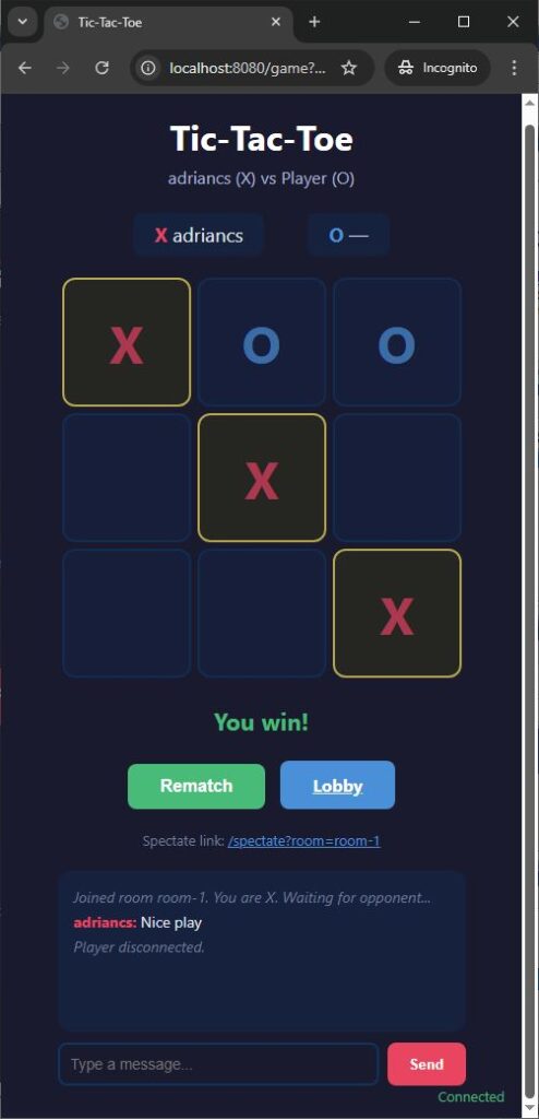 }Four validations before the move is accepted: game is in progress, it’s your turn, cell is empty, cell index is valid. Then update the board, check for a winner, switch turns, broadcast.