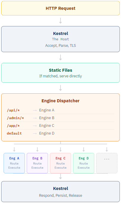 Between the host and the engines sits a thin layer: the Engine Dispatcher. Its role is simple. It reads a configuration — a mapping of URL path patterns to engine identifiers — and for each incoming request, it routes to the correct engine.